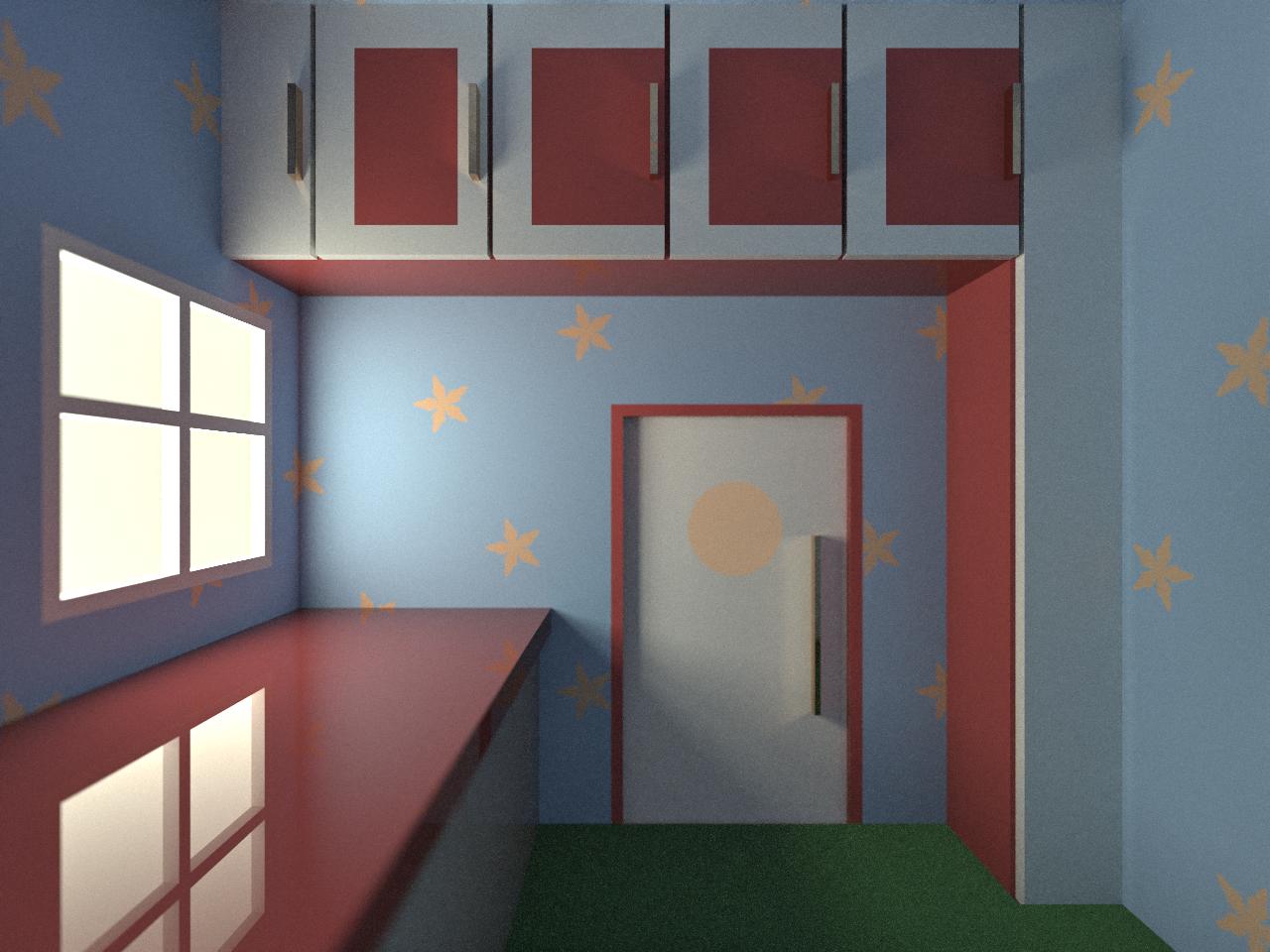 ./hou otherroom.scenegives a rough idea about the overall illumination at 16 samples per pixel (i.e., when the program prints 16), whereas the naive approach./hou otherroom.scene NAIVEonly produces a mess of white dots. - Rich visual effects: The algorithm samples all light path types so most physically based effects can be produced. The default scene demonstrates quite a few of them: reflection, area light, soft shadows, color bleeding, caustics, and depth-of-field blur. Of course, one can also get programmable-shading effects like procedural texturing and approximated Fresnel terms.